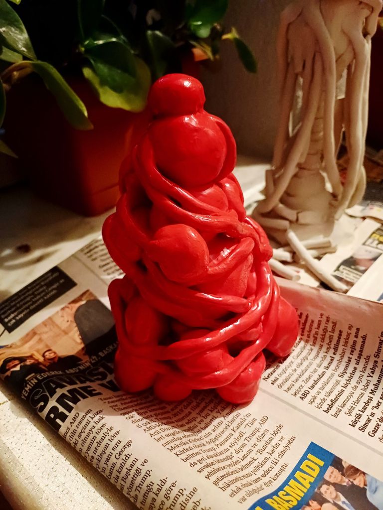 Kırmızı renk, hem bedensel hem de duygusal bir yoğunluğu temsil ederken; heykelin organik yapısı, içsel bir haritanın üç boyutlu bir karşılığı gibi okunabilir. Her açıdan farklı bir ilişki öneren bu form, tek bir anlamdan çok, çoğul olasılıklara açık bir yapı kurar.